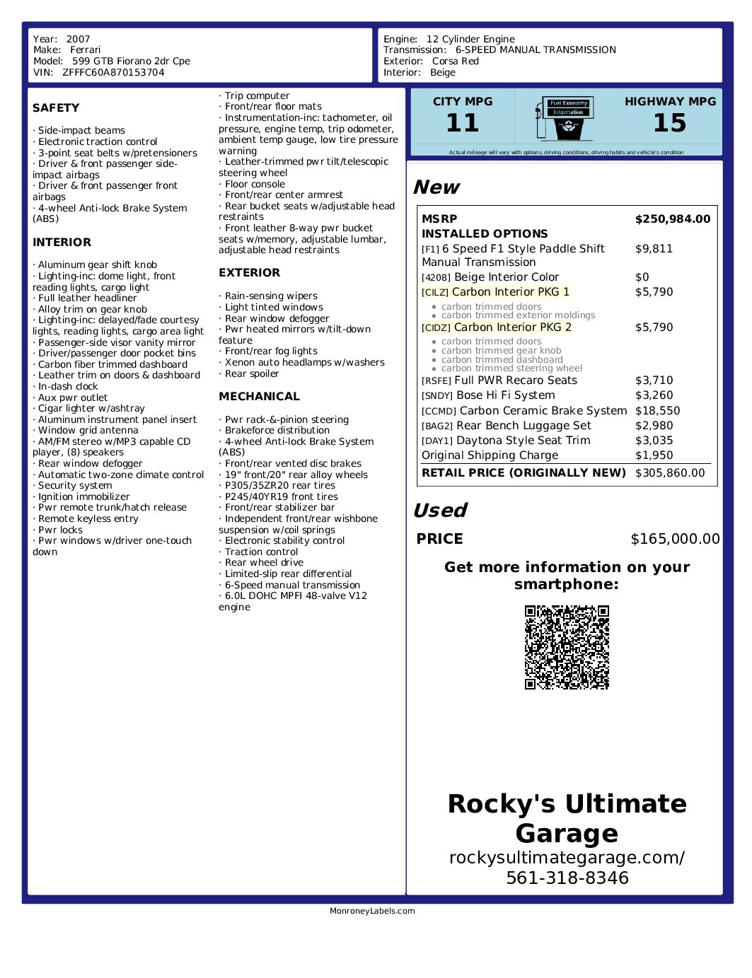 We invite you to call (561) 318-8346 or message us at your best convenience if you have any questions regarding this 2007 Ferrari 599 GTB Fiorano. We look forward to hearing from you.
