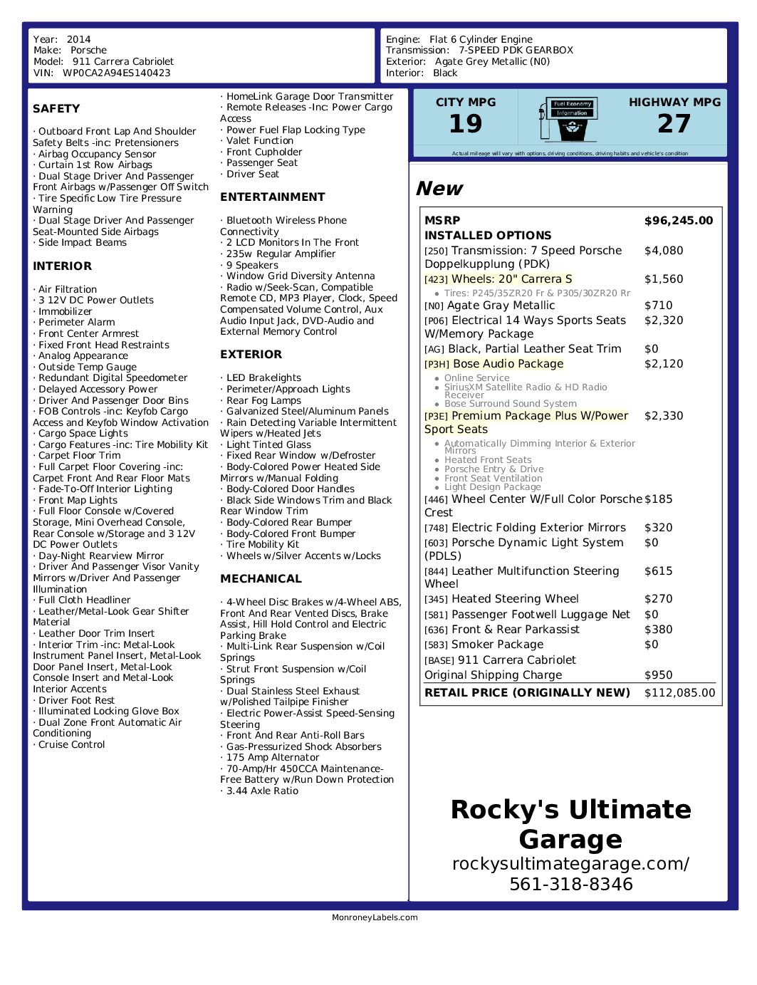 Rocky’s Ultimate Garage is pleased to present this completely stock 2014 Porsche 911 Carrera Cabriolet! This Agate Grey Sports Convertible has outstanding factory added options such as 20” Carrera S Wheels, Electrical 14-Way Sports Seats with Seat Memory, Bose Audio Package, Premium Package Plus, Front Seat Ventilation, Light Design Package, Electric Folding Mirrors, Porsche Dynamic Light System, Leather Interior with Leather Multifunction Steering Wheel, Front and Rear Park Assist and much more!We invite you to call or message us at your best convenience if you have any questions regarding this 2014 Porsche 911 Carrera. We look forward to hearing from you.
